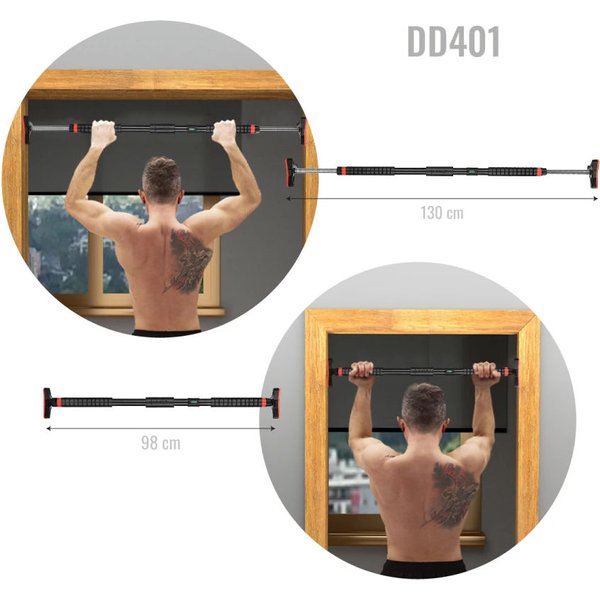 Wykonany z wysokiej jakości stali nierdzewnej, cechuje się wytrzymałością i stabilnością, co gwarantuje bezpieczeństwo podczas ćwiczeń. DD401 jest regulowany w zakresie 98-130 cm, dzięki czemu można go dopasować do różnych rodzajów drzwi. Montaż jest bardzo prosty i nie wymaga specjalistycznych narzędzi, a drążek posiada wbudowany klucz nasadowy. Dodatkowo, drążek jest łatwy do przechowywania i transportu, co czyni go idealnym wyborem dla osób, które chcą ćwiczyć w domu lub w podróży.