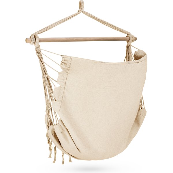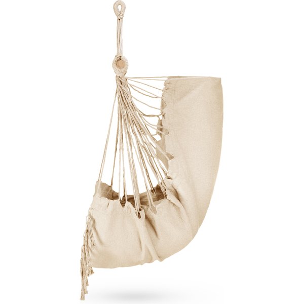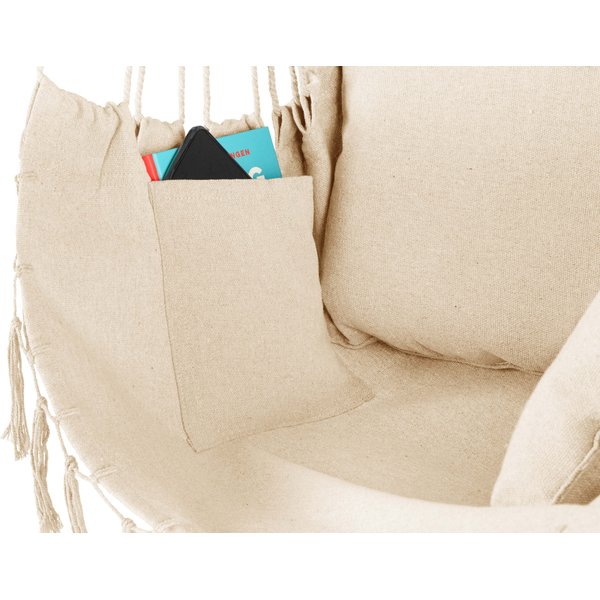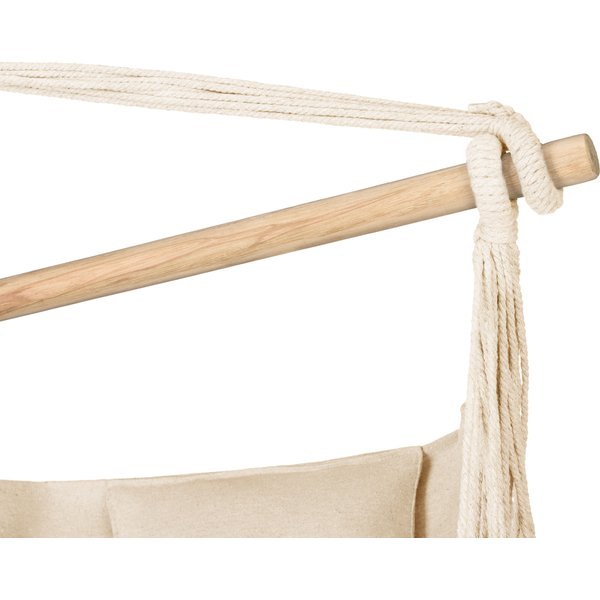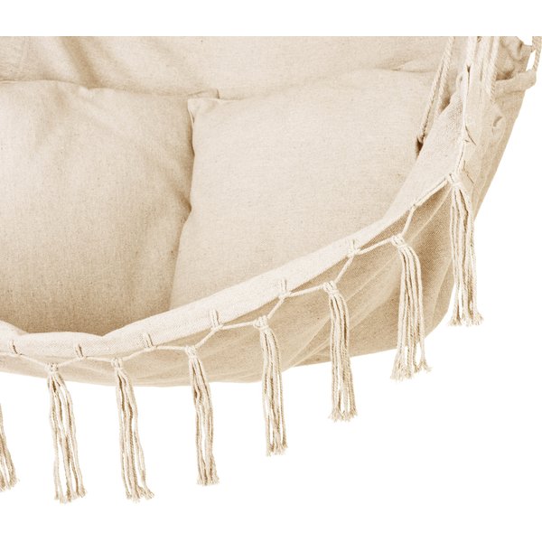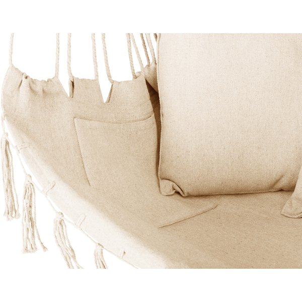 Hamak wykonano z wytrzymałego materiału będącego połączeniem bawełny i poliestru. Tkanina ta cechuje się podwyższoną odpornością na przetarcia i uszkodzenia mechaniczne. Również dzięki niej maksymalne obciążenie hamaka wynosi 140kg. Prosty montaż i kompaktowe wymiary sprawiają, że znajdziesz na niego miejsce nawet na niewielkim balkonie. Nic nie stoi na przeszkodzie, by fotel ten zamontować również w salonie czy sypialni. Przewiewna konstrukcja zapewnia komfort wypoczynku w upalne dni.