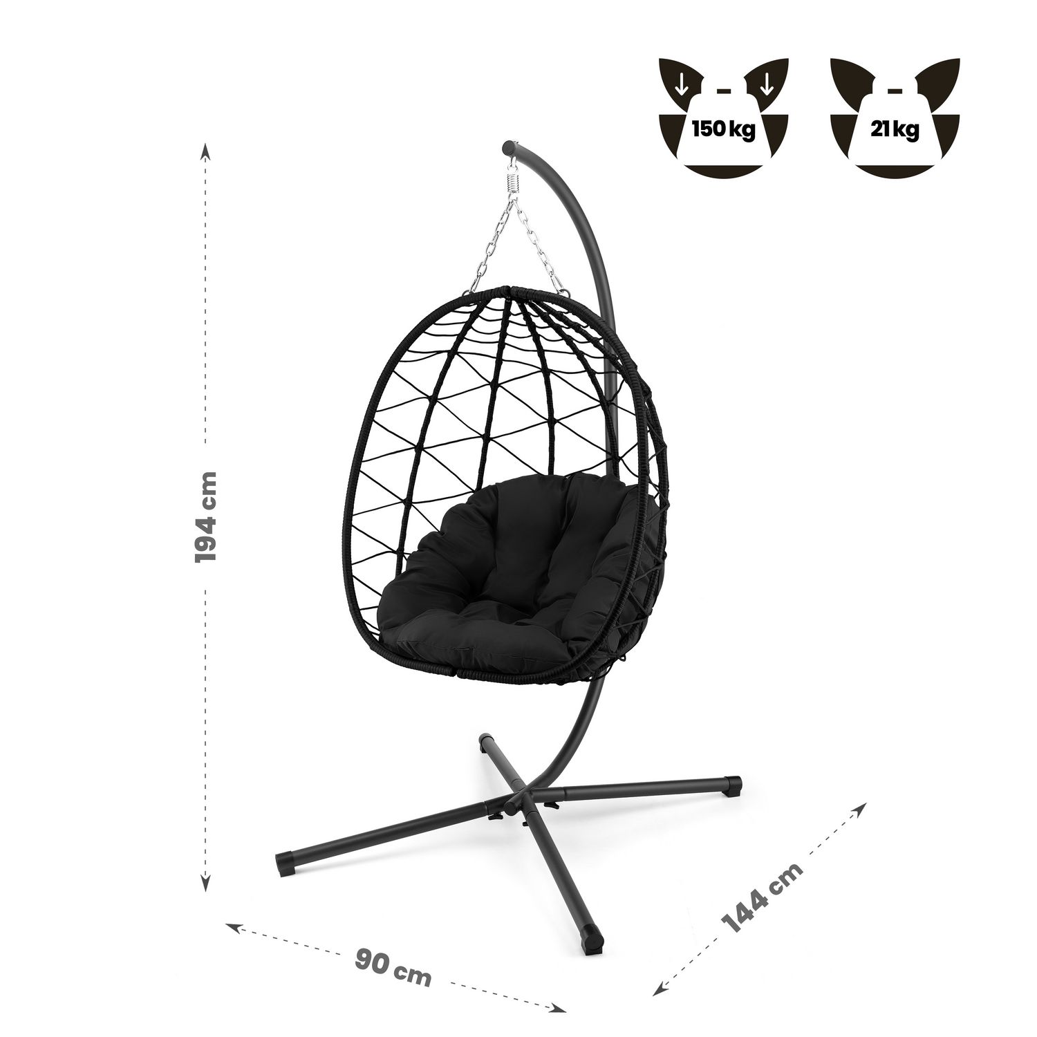 Szeroka podstawa oraz solidny system zawieszenia z łańcuchem i hakiem mocującym ze sprężyną zapewniają stabilne podparcie całej konstrukcji. Stelaż wykonany ze stali malowanej proszkowo zwiększa odporność na korozję i uszkodzenia mechaniczne, co przekłada się na trwałość oraz udźwig do 150 kg – także podczas dynamicznego bujania.
