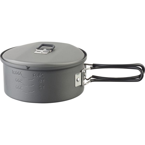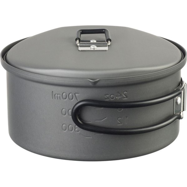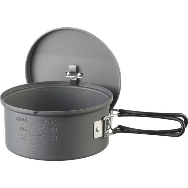 Garnek wykonany został z lekkiego anodowanego aluminium. Uchwyty z kolei wykonane zostały z odpornej na ciepło stali nierdzewnej z silikonową powłoką, która zapewnia pewny chwyt. Uchwyty są składane, co ułatwi transport i przechowywanie. Garnek posiada również praktyczne zawieszenie pokrywy, które zwiększy komfort podczas przygotowywania posiłków. Model ten posiada skalę objętości zarówno w mililitrach, jak i w uncjach. Świetnie sprawdzi się zarówno do przygotowywania posiłków, jak i do ich przechowywania. Do garnka dołączono torbę z siatki.
