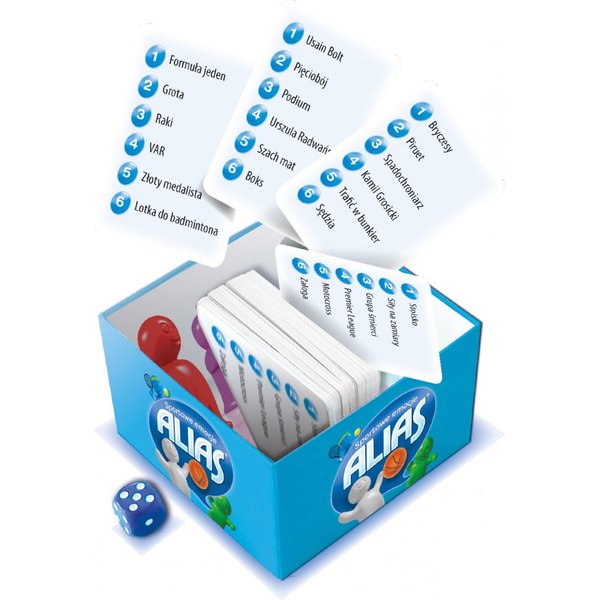 - zawartość: 100 kart z hasłami, 1 kostka, zasady gry