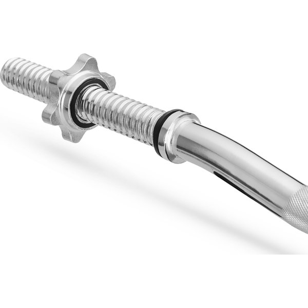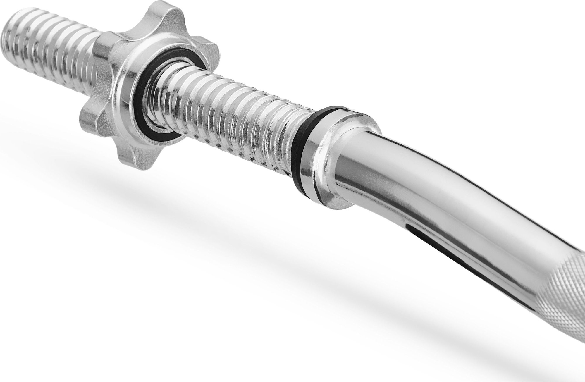 Ryflowana część chwytna o średnicy 28 mm zapewnia pewny, wygodny uchwyt, który minimalizuje ryzyko wyślizgnięcia się sztangi z rąk. Zastosowanie zacisków gwiazdkowych umożliwia szybkie i solidne zamocowanie talerzy, eliminując ich przesuwanie się nawet podczas intensywnych serii.