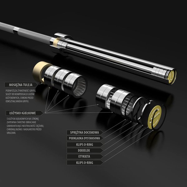 Dodatkowo, średnica części chwytnej wynosząca 28 mm zapewnia dużą wytrzymałość oraz komfort podczas ćwiczeń. Gryf olimpijski posiada aż 10 łożysk igiełkowych, które umożliwiają płynne obracanie się części na obciążenie. Dzięki temu, wykonywanie ćwiczeń staje się bardziej komfortowe. Konstrukcja gryfu eliminuje naprężenia na końcach wałeczków, co przekłada się na większą trwałość łożyska.