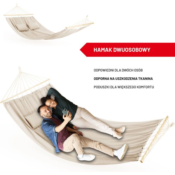 Hamak to doskonały wybór dla osób w każdym wieku. Dzięki niemu zrelaksujesz się, delikatnie bujając się w ogrodzie. Ten model został wyposażony w dwie praktyczne poduszki, które poprawią komfort Twojego odpoczynku. Ten hamak pozwoli na równoczesny relaks dla dwóch osób. Jego wymiary oraz udźwig są optymalne, by były na nim równocześnie dwie osoby dorosłe. Materiał jest wytrzymały oraz miły w dotyku, więc nie podrażnia i "nie gryzie" skóry. Właśnie dlatego możesz leżeć na nim w krótkich spodenkach, bez konieczności korzystania z koca.