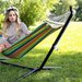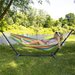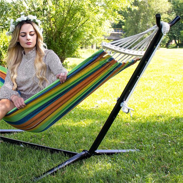Hamak jednoosobowy Springos to idealny produkt dla każdego, kto ceni sobie relaks i spokojny wypoczynek na świeżym powietrzu. Duży rozmiar tkaniny o wymiarach 200x100 cm pozwala na korzystanie z niego nawet przez dwie osoby, a maksymalne obciążenie wynoszące 150 kg, zapewnia bezpieczeństwo użytkowania. Hamak wykonany jest z wysokogatunkowej tkaniny bawełnianej z domieszką poliestru, co sprawia, że jest on przyjazny dla ciała i gwarantuje wysoki komfort w upalne dni. Dodatkowo, hamak wzmocniony dwoma drewnianymi belkami, dzięki czemu tkanina lepiej się układa, nawet przy korzystaniu z niego tylko przez jedną osobę. Hamak jest łatwy do zawieszenia w dowolnym miejscu i dzięki lekkości i łatwości w transporcie, można go zabrać ze sobą na wakacje czy piknik.
