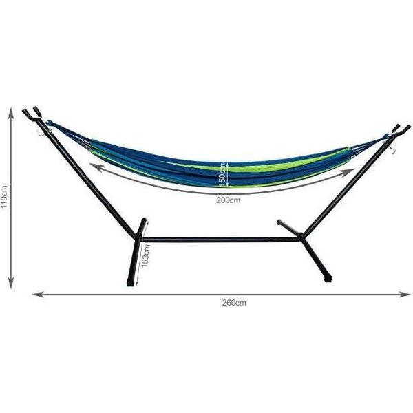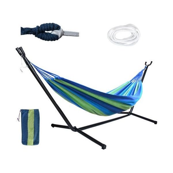 Po dniu na wysokich obrotach nie ma nic lepszego niż odpoczynek z książką i lemoniadą kołysząc się w hamaku. Prezentowany 2-osobowy model posiada odpowiednie wymiary by zapewnić komfortowy wypoczynek Tobie i Twojej drugiej połówce jednocześnie. Hamak posiada również w komplecie solidny stalowy stelaż, który jest odporny na niekorzystne warunki atmosferyczne i świetnie sprawdza się w ogrodzie, na działce, a nawet na balkonie, gdzie nie ma zadrzewienia lub słupów do zamocowania konstrukcji.