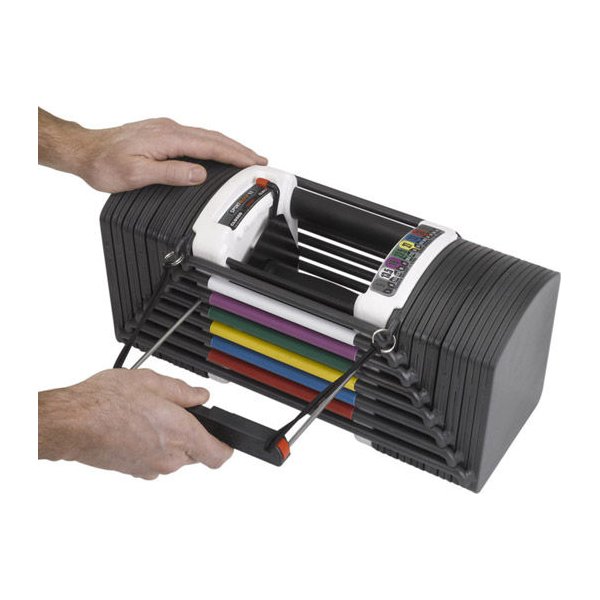 Łatwy, innowacyjny system regulacji doboru ciężaru ułatwiają różnokolorowe, stalowe pręty umieszczone po obu stronach hantli. Niewielki rozmiar PowerBlock skupia ciężar bliżej dłoni zwiększając tym samym kontrolę nad urządzeniem.