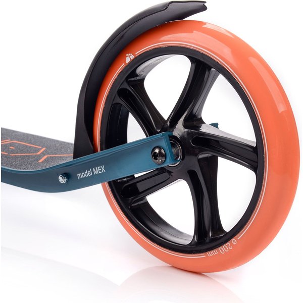 Wszystkie śruby, łączące oraz zabezpieczające wykonane zostały ze stali, co przekłada się na podwyższoną trwałość łączeń. Gumowe uchwyty na kierownicy zapewniają pewny chwyt i właściwości antypoślizgowe. Duże koła 200mm osadzone na łożyskach ABEC-7 zapewniają płynność i szybkość jazdy. Mex to hulajnoga dedykowana dla użytkowników o maksymalnej wadze 100kg. Pojazd wykazuje zgodność z normą PN-EN 14619:2019-11E, co jest gwarancją bezpieczeństwa. Bezpieczeństwo jazdy podnosi hamulec nożny na tylnym kole. Z hulajnogą otrzymasz niezbędne do montażu klucze, a także instrukcję obsługi.
