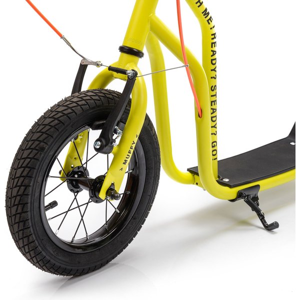 Muffy posiada ergonomicznie wyprofilowaną kierownicę z gumowymi uchwytami, którą łatwo można dostosować do wzrostu małego skatera. Pompowane koła o średnicy 12" sprawiają, że jazda jest płynna, a nierówności podłoża są nieodczuwalne. Hamulec z przodu i z tyłu umożliwia szybkie i bezpieczne zatrzymanie hulajnogi w razie potrzeby. Optymalne wymiary podestu zapewniają stabilne podparcie dla stóp. Składana stopka pozwala na wygodne pozostawienie hulajnogi na czas postoju. Muffy to hulajnoga przeznaczona dla dzieci w wieku 6+.