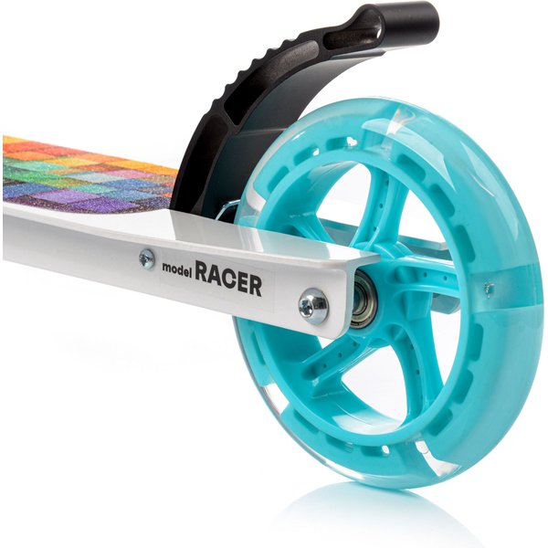 Hulajnoga Racer Cube Meteor to idealny wybór dla miłośników rekreacyjnej jazdy, łącząc prostotę z nowoczesnym designem. Wykonana z wysokiej jakości aluminium, jest lekka, a zarazem wytrzymała. Gumowe rączki na kierownicy zapewniają pewny chwyt, a 3-stopniowa regulacja wysokości umożliwia dopasowanie do wzrostu użytkownika. Duży, niski podest ułatwia utrzymanie równowagi, a koła o średnicy 140 mm z wysokiej jakości łożyskami gwarantują płynność i stabilność jazdy. Składana konstrukcja ułatwia przenoszenie i przechowywanie, a tylny błotnik chroni przed ochlapaniem, jednocześnie służąc jako hamulec.
