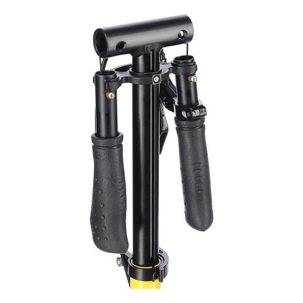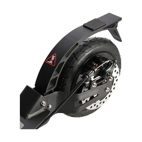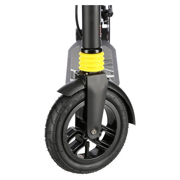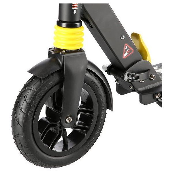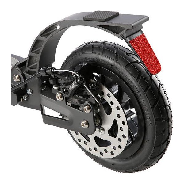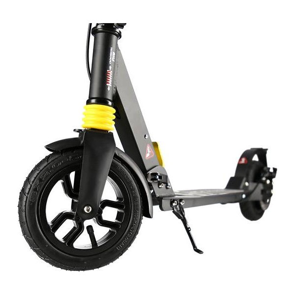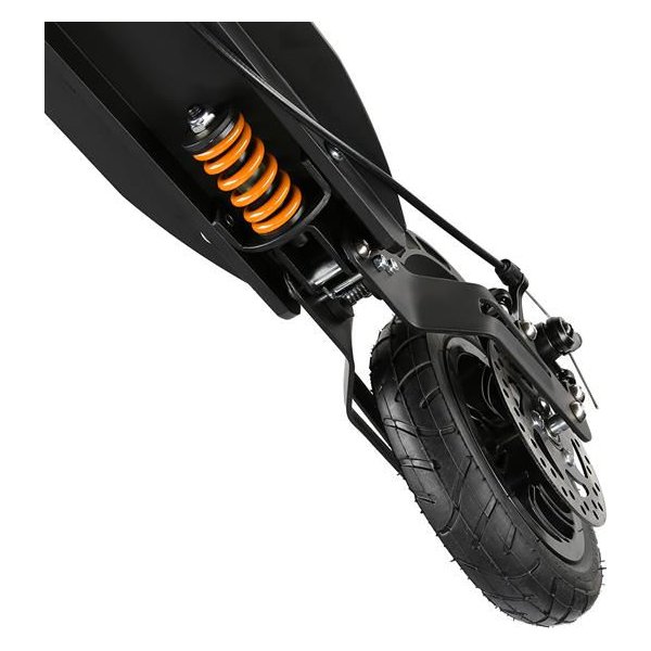 Dużym atutem hulajnogi są dwa sprawnie działające amortyzatory - przedni pionowy oraz tylny poziomy. Gwarantują one wygodną jazdę nawet po wertepach, pochłaniając wstrząsy i ograniczając drgania. Hulajnoga posiada pompowane koła, błotniki i wysokiej klasy, bardzo płynnie działające łożyska ABEC9, które również zwiększają bezpieczeństwo i komfort jazdy na nierównym podłożu. Dla miłośników dużych prędkości ważną sprawą jest sprawne hamowanie. W tym przypadku masz do dyspozycji nie tylko hamulec nożny, ale także hamulec tarczowy, bardzo skuteczny, szczególnie na mokrym podłożu. Wygodna do trzymania kierownica posiada gumowe chwyty, które nie powodują otarć i mają właściwości antypoślizgowe.
