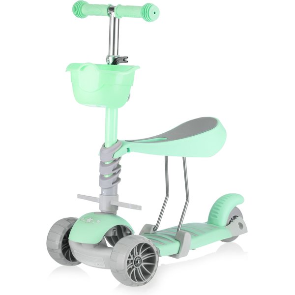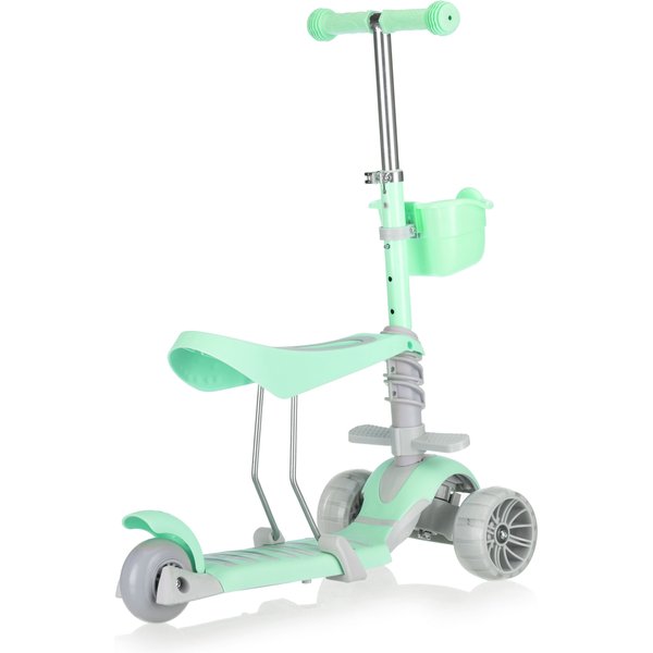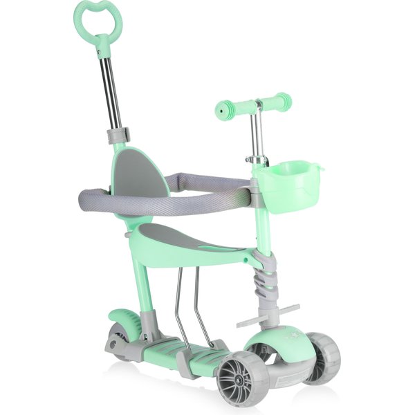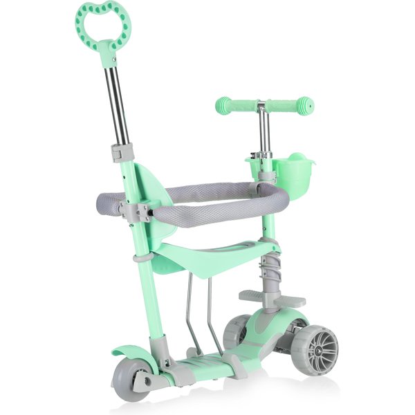 - 5w1 – wielofunkcyjność na lata: Hulajnoga łączy aż pięć trybów: jeździk z rączką i boczną ochroną, jeździk z rączką, hulajnogę z siedziskiem, balansową z koszyczkiem oraz klasyczną hulajnogę – dzięki temu dopasowuje się do wieku i umiejętności dziecka.
