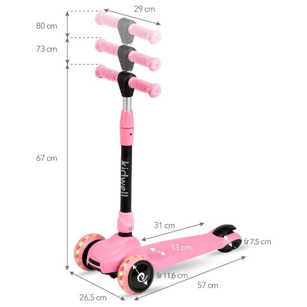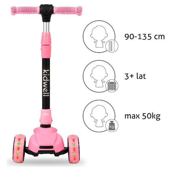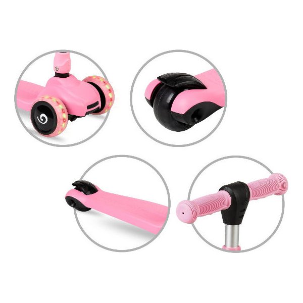 Wyposażona została w trwałą i wytrzymałą konstrukcję, która gwarantuje długie użytkowanie i bezpieczeństwo. Trzy koła zapewnią odpowiednią stabilność, dzięki czemu dziecko bez obaw będzie chciało przemierzać kolejne kilometry. Dodatkowo posiadają one wbudowane oświetlenie LED, co z pewnością doda atrakcji podczas jazdy. Regulacja kierownicy pozwala dostosować jej wysokość do wzrostu maluszka, a ergonomiczne uchwyty zapewnią pewny chwyt. Aby zapewnić jak największe bezpieczeństwo, hulajnoga posiada duży i antypoślizgowy podest, który uniemożliwi ześlizgnięciu się stopy podczas jazdy.