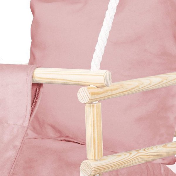 Stelaż huśtawki jest wykonany z solidnego drewna, a materiałowe poduszki zapewnią wygodę oraz komfort. Całość jest zawieszona na mocnych sznurach, które są zakończone metalowymi obręczami, tak, aby jej zawieszenie było ułatwione. Dobre materiały i dbałość o wykonanie zapewnią długie i komfortowe używanie produktu.