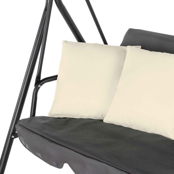 Szerokie siedzisko umożliwia jednoczesny wypoczynek trzech osób, zapewniając przestronność i swobodę. Dołączone miękkie poduszki sprawiają, że korzystanie z huśtawki staje się jeszcze bardziej relaksujące.