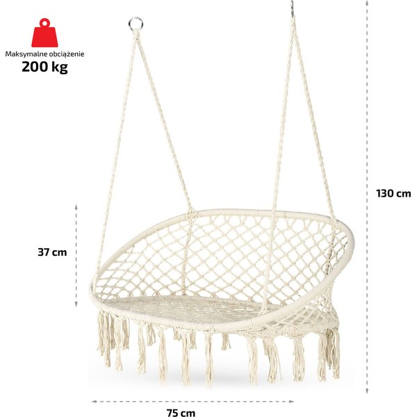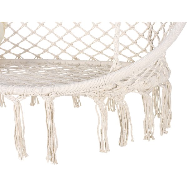 Huśtawka świetnie się prezentuje, co wynika z wysokiej jakości wykonania. Modny styl Boho wpasuje się w domową przestrzeń. Delikatna kolorystyka i frędzle sprawią, że Twoje mieszkanie będzie przytulniejsze.