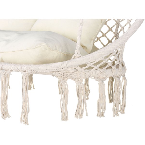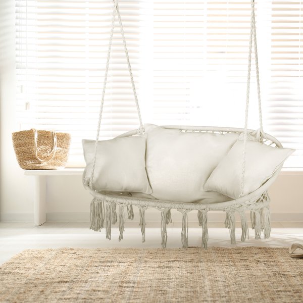 Ta huśtawka to harmonijne połączenie stylu, komfortu i trwałości. Wykonana ręcznie z grubej, wytrzymałej bawełny, zachwyca starannością wykonania i odpornością na przetarcia. Jej naturalny wygląd doskonale komponuje się zarówno z wnętrzami, jak i przestrzenią na świeżym powietrzu – sprawdzi się w ogrodzie, na tarasie czy w salonie, tworząc przytulny kącik do relaksu.