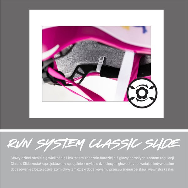 Użyty materiał Hi EPS tworzy strukturę pochłaniającą uderzenia, ale nie ma to negatywnego wpływu na jego wagę. Zapięcie Ergomatic jest z pokrętłem, za pomocą którego z łatwością uda się regulować obwód w celu najdokładniejszego dopasowania. Tylna część kasku jest zaprojektowana w taki sposób, aby dopasowywał się do fotelika rowerowego. Odblaskowe naklejki na powierzchni sprawią, że pociecha będzie widoczna także po zmroku!