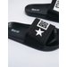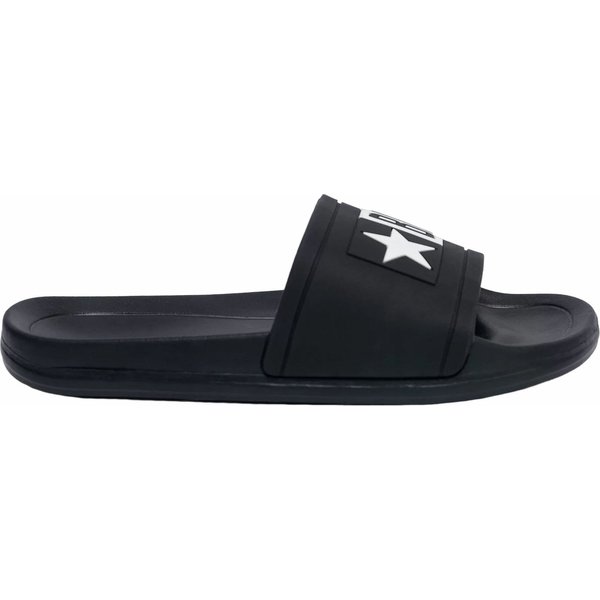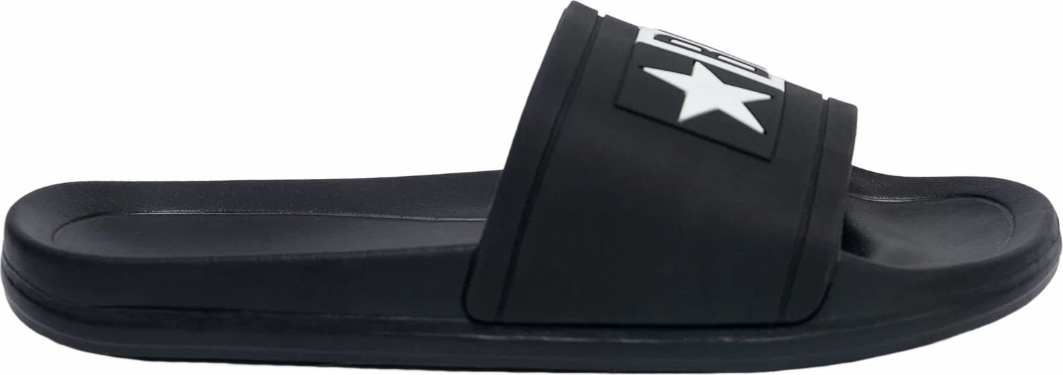 Klapki mają szeroki pasek, na którym uwidocznione zostało logo marki. Obuwie jest wygodne, co wynika z wsuwanej konstrukcji i płaskiej podeszwy. Materiał, z którego wykonano obuwie jest trwały i nie chłonie wilgoci, dlatego buty wykorzystasz na basenie i na plaży.