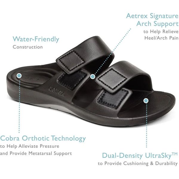 Dzięki unikalnemu systemowi ortopedycznemu Aetrex, te klapki zapewniają nie tylko wygodę, ale także zdrowie stóp. Jedną z kluczowych cech tych klapek jest wsparcie łuku stopy, które pomaga ustabilizować i wyrównać stopy, co przyczynia się do złagodzenia bólu stóp i zapalenia powięzi podeszwowej. Dodatkowo, pełne wsparcie pod stopą dzięki technologii ortopedycznej zapewnia przestrzeń w obszarze pięty, zmniejszając nacisk na tę część stopy. Klapki Milos Aetrex zostały wykonane z lekkiej pianki UltraSky EVA, co gwarantuje nie tylko trwałość, ale także maksymalny komfort dla stóp przez cały dzień. Dodatkowo, amortyzacja przedniej części stopy oraz podeszwa o podwójnej gęstości zapewniają ulgę i absorpcję wstrząsów, co pozytywnie wpływa na kondycję stóp.