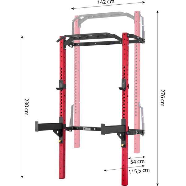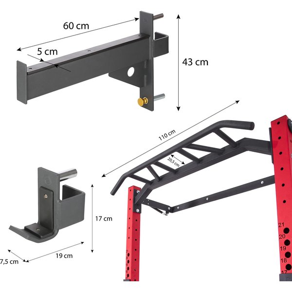 - drążek do podciągania: szerokość: 110 cm, głębokość: 20,5 cm, odległość drążka od ściany po rozłożeniu: 73 cm, odległość drążka od ściany po złożeniu: 31 cm