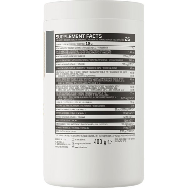 Peptydy kolagenu rybiego (hydrolizowane), inulina, sole magnezowe kwasu cytrynowego (magnez), metylosulfonylometan (MSM), kwas l-askorbinowy (witamina C), siarczan chondroityny, siarczan D-glukozaminy 2KCL (ze skorupiaków), ekstrakt skrzypu polnego (Equisetum arvense) L.) standaryzowany na 7% krzemionkę, ekstrakt oleożywicy z kadzidła (Boswellia serrata Roxb. ex Colebr.) – 65% kwasów bosweliowych, ekstrakt z dzikiej róży (Rosa canina L.) standaryzowany na 70% witaminy C, L-lizyna HCl, substancja przeciwzbrylająca substancja: dwutlenek krzemu; aromaty, hialuronian sodu (kwas hialuronowy), substancja słodząca: sukraloza; substancje zagęszczające: guma ksantanowa, guma arabska; regulator kwasowości: kwas cytrynowy; cholekalcyferol (witamina D), menachinon-7 MK-7 (witamina K) pochodzący z Bacillus subtilis natto, octan DL-alfa tokoferylu (witamina E), heksanikotynian inozytolu (niacyna), D-pantotenian wapnia (kwas pantotenowy), pirydoksal 5' -fosforany (witamina B6), D-biotyna (biotyna). Wyprodukowano w zakładzie przy użyciu składników pochodzących z mleka (w tym laktozy), soi, orzeszków ziemnych, innych orzechów, nasion sezamu, zbóż zawierających gluten, jaj.