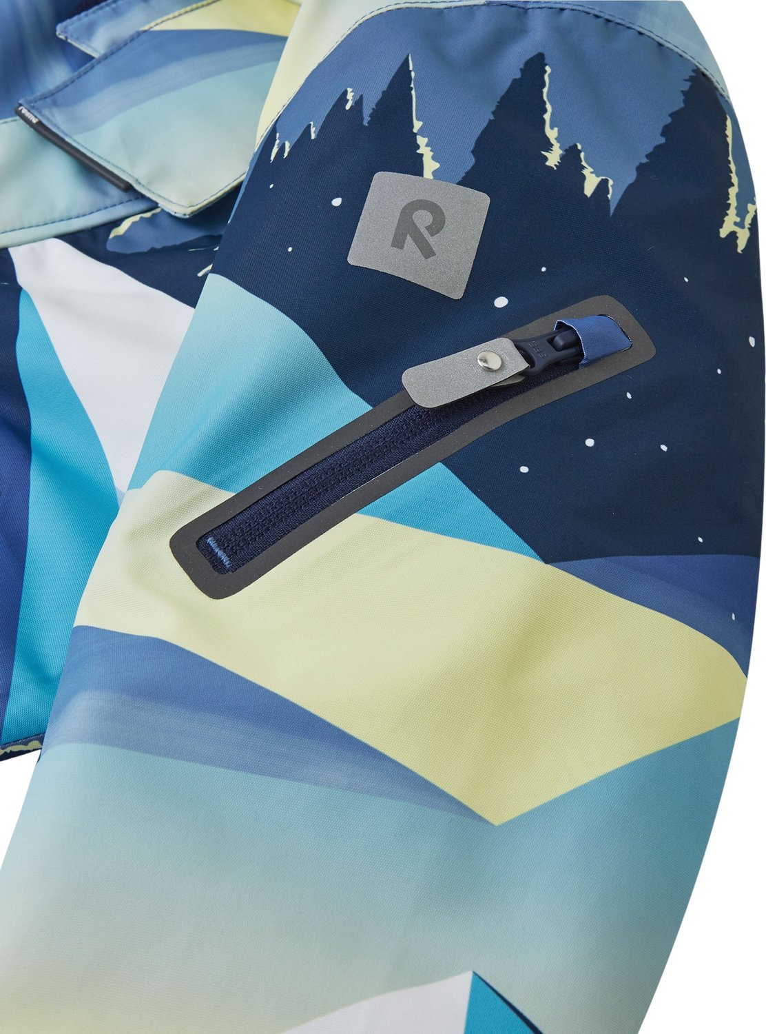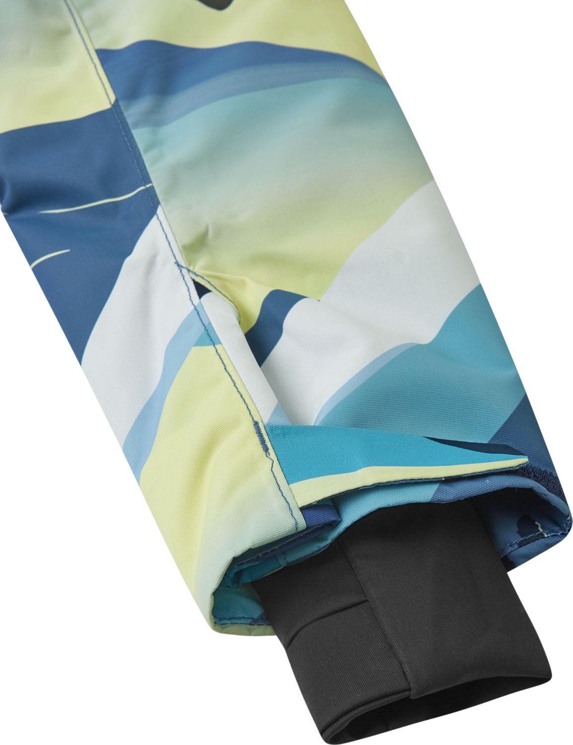Regulowana talia oraz mankiety, zarówno na rękawach, jak i nogawkach, umożliwiają idealne dopasowanie, co zwiększa wygodę noszenia i dodatkową ochronę przed zimnem. Elastyczne wewnętrzne mankiety z otworami na kciuki to praktyczny dodatek, który zapewnia ciepło dłoniom i zapobiega przedostawaniu się śniegu do rękawów. Kombinezon oferuje również liczne kieszenie, w tym specjalną kieszonkę na karnet narciarski na rękawie, co ułatwia dostęp do niezbędnych drobiazgów. Elementy odblaskowe zwiększają widoczność dziecka po zmroku, co jest nieocenioną zaletą w kontekście bezpieczeństwa. Materiał kombinezonu jest odporny na zabrudzenia, a możliwość suszenia w suszarce bębnowej ułatwia jego pielęgnację. Warto również podkreślić, że produkt spełnia rygorystyczne normy ekologiczne, będąc wytworzonym z materiałów zatwierdzonych przez bluesign i zawierającym izolację w 100% z recyklingu. Stylowy wzór z motywem górskim dodaje kombinezonowi charakteru, a logo marki na rękawie jest gustownym akcentem.