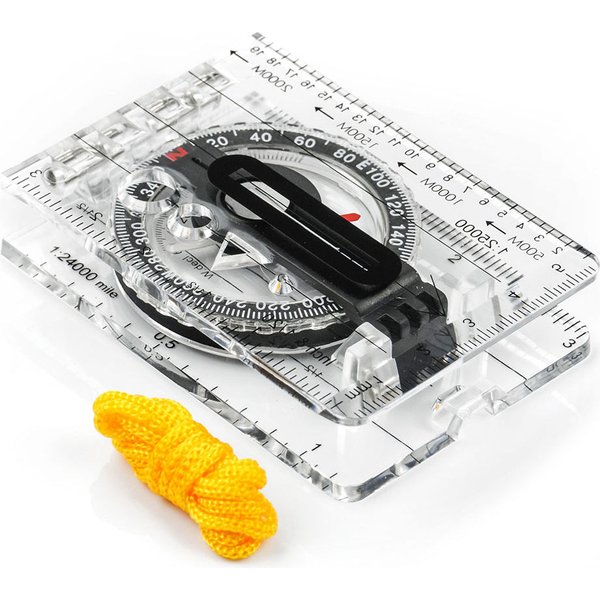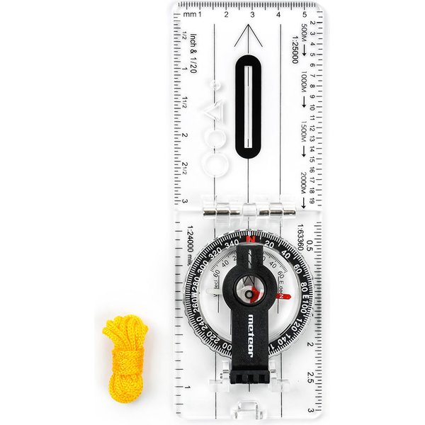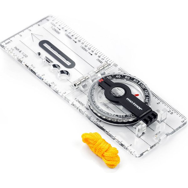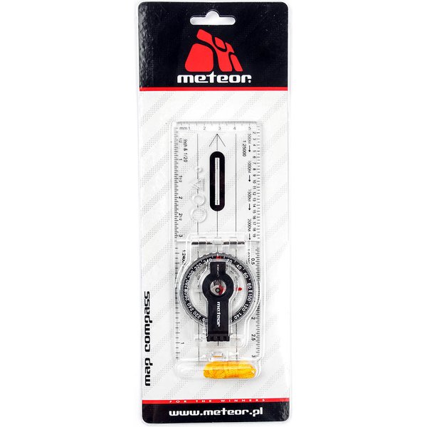 Kompas Meteor linijka składany z lupą przeznaczony do określenia stron świata, oraz wyznaczania azymutu na mapie. Kompas posiada obrotową tarczę, wykresy do przeliczania skali mapy na odległość oraz linijkę 5cm.