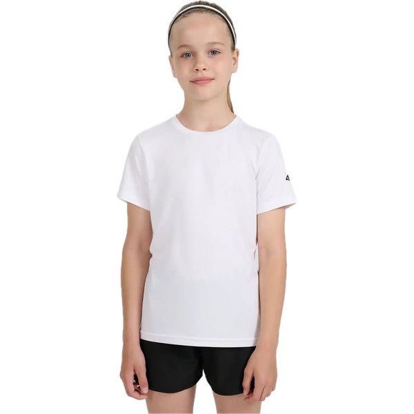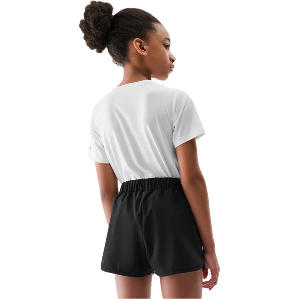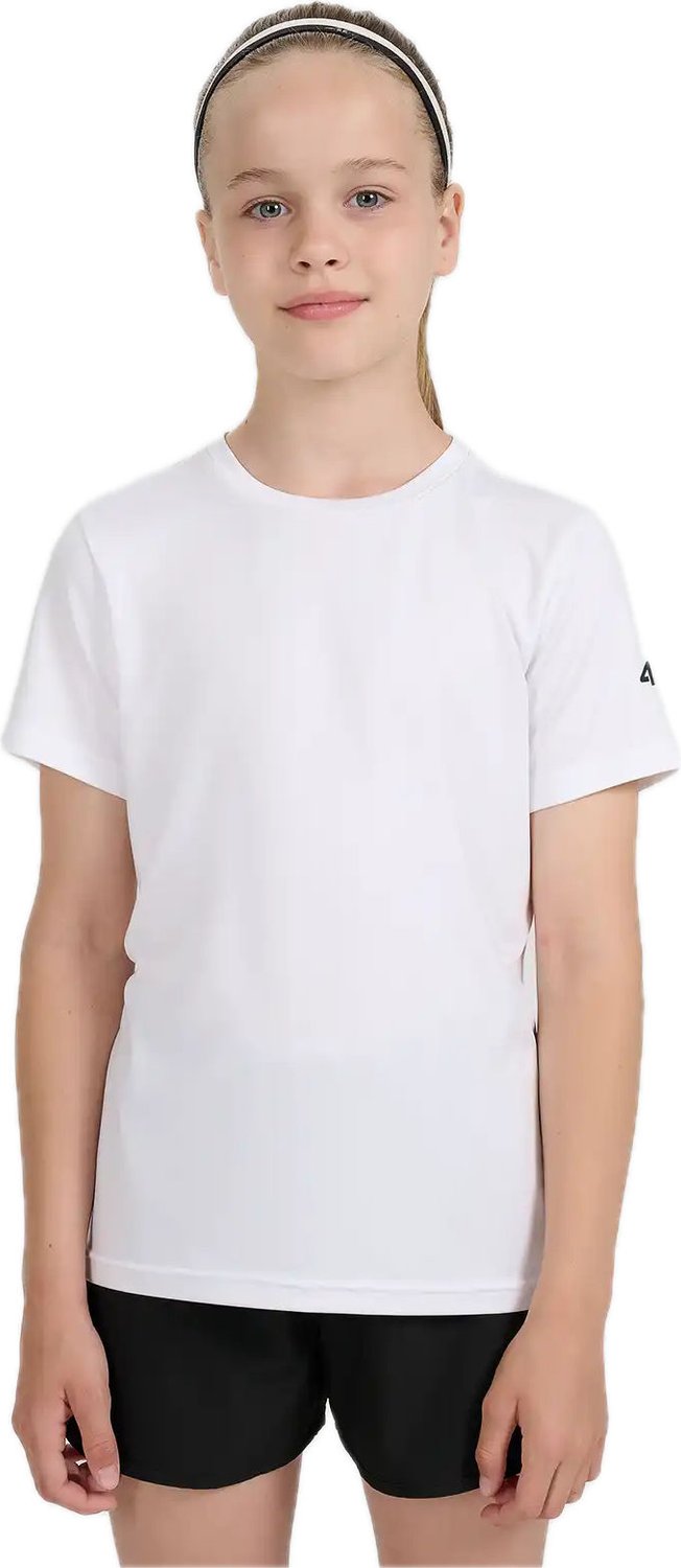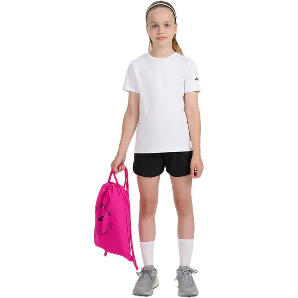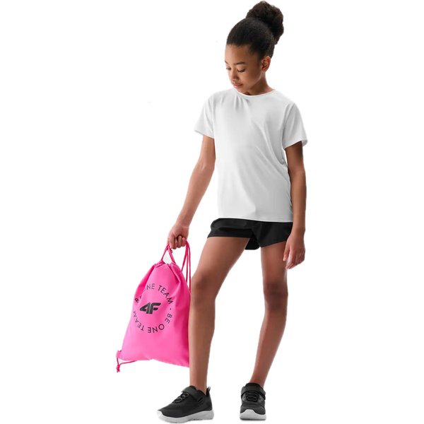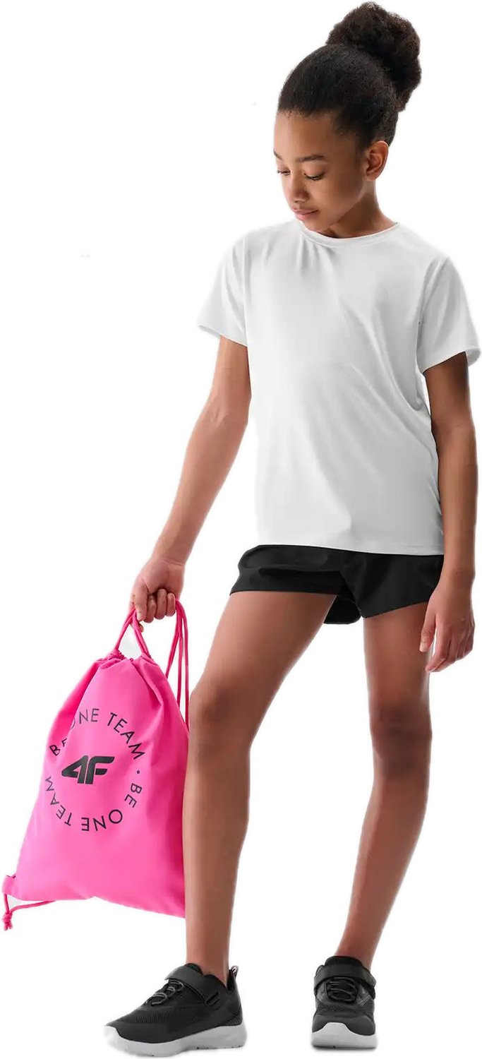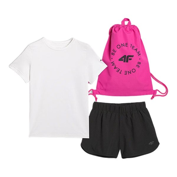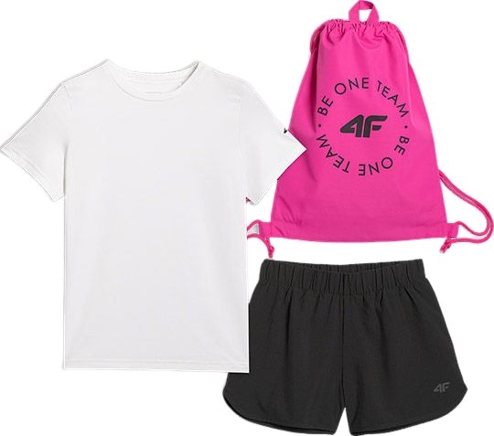 Komplet sportowy dla dziewcząt marki 4F to idealne rozwiązanie na aktywne dni. Koszulka z krótkim rękawem i okrągłym dekoltem wykonana jest z elastycznej, szybkoschnącej dzianiny, co zapewnia komfort noszenia i swobodę ruchów. Szorty, z lekkiej dzianiny, wyposażone w elastyczną talię, idealnie dopasowują się do sylwetki, gwarantując wygodę podczas każdej aktywności. Do zestawu dołączony jest praktyczny plecak-worek z nadrukiem, który dzięki sznurkowym szelkom i uchwytowi można łatwo zawiesić w szatni. Ten komplet to połączenie funkcjonalności i stylu, które zachwyci każdą młodą miłośniczkę sportu.