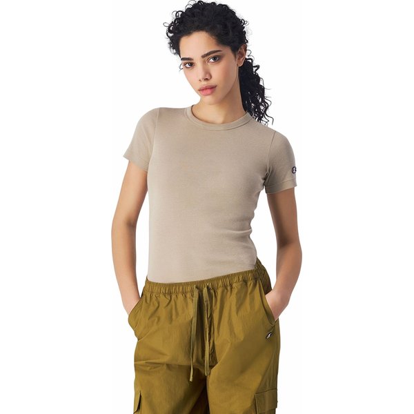 Koszulka damska Champion C Logo Patch Crewneck Legacy to doskonały wybór dla aktywnych kobiet, które cenią sobie komfort i styl. Wykonana z miękkiego, prążkowanego bawełnianego materiału o gramaturze 190 g/m2, zapewnia uczucie delikatności na skórze. Jej dopasowany krój podkreśla kobiecą sylwetkę, zapewniając idealne dopasowanie do ciała. Koszulka posiada wycięcie pod szyją i krótki rękaw, co sprawia, że jest idealna na ciepłe dni. Dodatkowo, na lewym rękawie znajduje się haftowane logo C, dodając mu unikalnego charakteru. Może być zestawiona zarówno z krótkimi spodenkami, jak i kurtką z guzikami, a w połączeniu z wysokimi białymi butami stworzy modny i wygodny outfit.