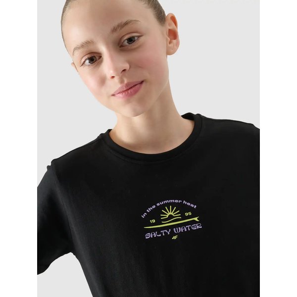 Dziewczęca koszulka od 4F to doskonały wybór dla młodych miłośniczek komfortu i stylu. Wykonana w 100% z bawełny, zapewnia wyjątkową miękkość i przewiewność, co sprawia, że jest idealna na każdą porę roku. Delikatna dzianina single jersey jest przyjemna dla skóry i nie krępuje ruchów. Prosty krój z krótkim rękawem i okrągłym dekoltem to gwarancja swobody noszenia. Stylowy nadruk na przodzie podkreśla nowoczesny charakter, a logo marki dodaje elegancji. Gładka powierzchnia i wytrzymałe szwy boczne to cechy, które zapewniają trwałość i długotrwałe zadowolenie z użytkowania.