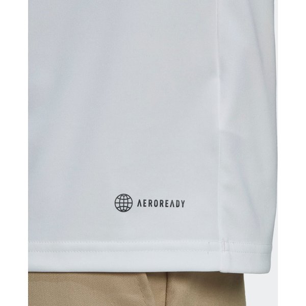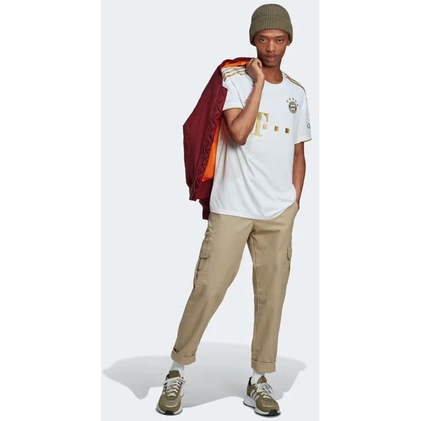 Gładka dzianina to pochodzący z recyklingu poliester o podwójnym splocie. Dzięki technologii Aeroready specjalne włókna schładzają ciało i przyśpieszają odprowadzanie wilgoci, więc skóra pozostaje komfortowo sucha i świeża, nawet podczas intensywnych treningów. Panele z siateczki pod ramionami dodatkowo wspierają wentylację. Standardowy krój z okrągłym dekoltem jest wygodny, pozwala zachować całkowitą swobodę ruchu. Krótkie rękawy są zakończone ściągaczami, ubranie dobrze leży i dopasowuje się do ciała. T-shirt zdobią aplikacje nawiązujące do Bayernu Monachium, co z pewnością ucieszy kibiców.