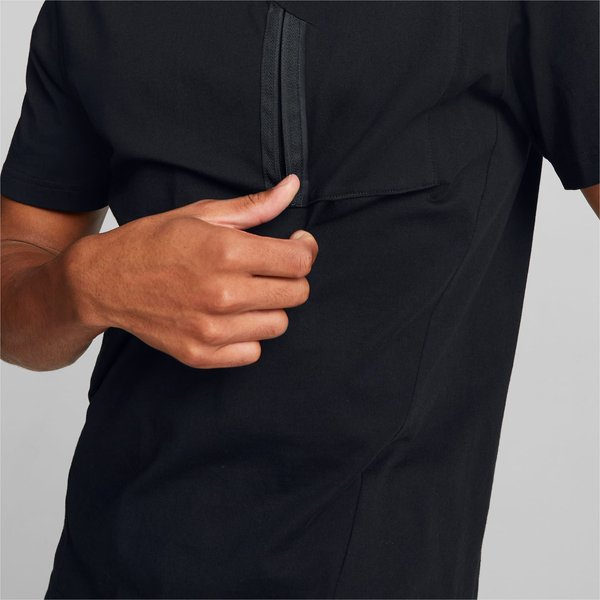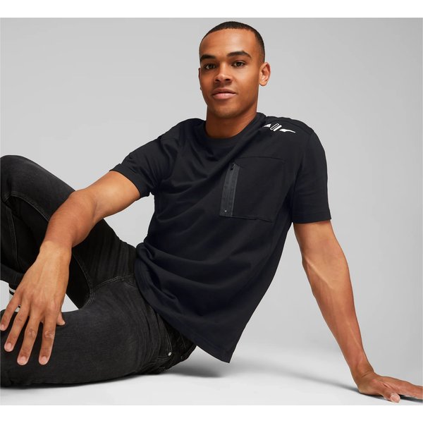 Koszulka wykonana została z oddychającego i wytrzymałego materiału, dzięki czemu posłuży przez długi czas, a także zapewni wysoki komfort. Luźny krój zapewni swobodę ruchów i wygodę przez cały dzień. Na piersi umieszczona została praktyczna kieszeń zapinana na zamek, która sprawdzi się na drobiazgi. Połączenie to zapewnia modny wygląd i świetną funkcjonalność. Na ramieniu umieszczono napis PUMA oraz nadruk PUMA Formstrip, które dodają koszulce ciekawszego wyglądu.