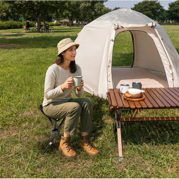 - Ultrakompaktowa konstrukcja: Lekka, składana budowa sprawia, że krzesło łatwo zmieści się w plecaku lub można je wygodnie przenosić dzięki zintegrowanemu uchwytowi.