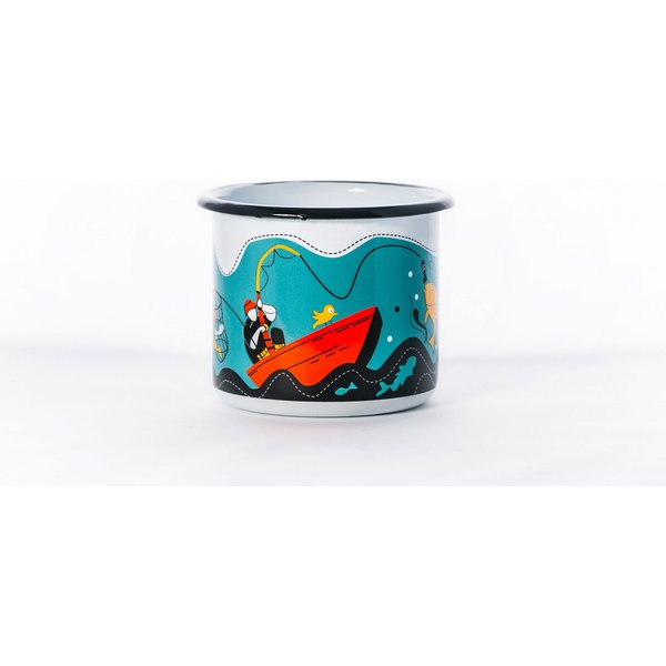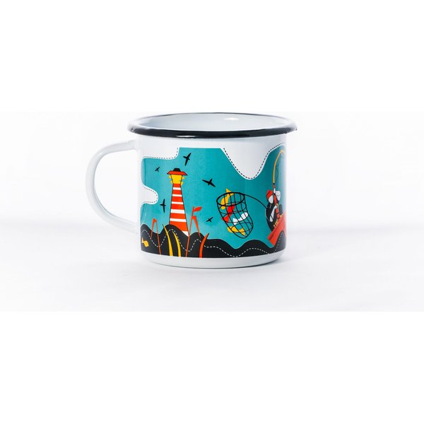 Kubek wytłoczony został w fabryce emalii w Olkuszu. Sprawdzi się on zarówno do napojów zimnych, jak i gorących, a wykonanie z emaliowanej stali zapewni gwarantuje wysoką jakość. Produkt został udekorowany oryginalnym motywem wędkarskim nawiązującym do historii o złotej rybce, która spełniała życzenia żony rybaka. Kiedy straciła cierpliwość, machnęła ogonem, wskoczyła w fale i odpłynęła w stronę morza. Czary prysły, a rybak odnalazł żonę płaczącą na stercie śmieci.