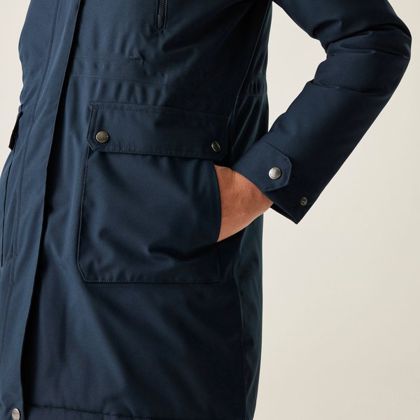 Dzięki przemyślanej konstrukcji, kurtka Valenta dba o styl i wygodę noszenia. Regulowany ściągacz w talii pozwala na idealne dopasowanie do sylwetki, podkreślając jej atuty. Długość kurtki sięgająca do połowy uda oraz prosty krój sprawiają, że pasuje ona do wielu stylizacji, niezależnie od okazji. Kurtka została wyposażona w liczne kieszenie, które podnoszą jej funkcjonalność. Dwie zasuwane kieszenie na piersi oraz dwie dolne naszywane kieszenie z bocznymi wejściami do ogrzania dłoni to praktyczne rozwiązania, które umożliwiają przechowywanie niezbędnych drobiazgów oraz chronią dłonie przed zimnem. Wewnętrzna kieszeń zapinana na zamek błyskawiczny to dodatkowe miejsce na przechowywanie cennych rzeczy, takich jak telefon czy portfel.