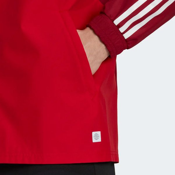 Kurtka wykonana została z wytrzymałego poliestru, który w 100% pochodzi z recyklingu. Regularny krój zapewnia swobodę ruchów i komfort podczas wykonywania wszelkich aktywności. Model ten posiada zamek na całej długości, który pozwoli Ci na dostosowanie kurtki do panujących warunków. Elastyczne mankiety sprawią, że rękawy będą się dobrze trzymały na swoim miejscu i zapobiegną przedostawaniu się pod spód kurtki zimnego powietrza. Z kolei kaptur ze ściągaczem zwiększy ochronę przed wiatrem i opadami. Model ten posiada właściwości wodoodporne. Z przodu umieszczono kieszenie na suwak, które pozwolą na wygodne przechowywanie drobiazgów. Kurtka ta doskonale sprawdzi się podczas wykonywania codziennych obowiązków oraz podczas gry w piłkę, a przy tym zapewni modny wygląd.