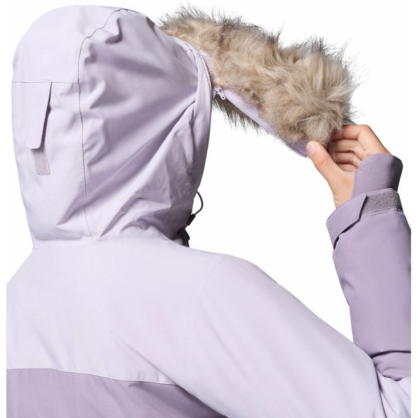 Kolejną zaletą jest wyściółka Omni-Heat. Dzięki zastosowaniu srebrnych kropek, które odbijają ciepło ciała, kurtka skutecznie zatrzymuje ciepło, gwarantując komfort cieplny nawet przy niskich temperaturach. To sprawia, że użytkowniczka może cieszyć się ciepłem i wygodą przez cały dzień na stoku, niezależnie od panujących warunków. Kaptur kompatybilny z kaskiem, regulowany sznurkiem, zapewnia idealne dopasowanie i ochronę głowy przed wiatrem i śniegiem. Dodatkowo, odpinane sztuczne futro daje możliwość personalizacji wyglądu oraz dodatkowego ocieplenia.