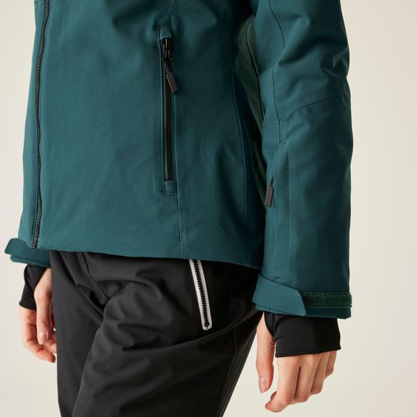 Dla miłośniczek funkcjonalnych rozwiązań, kurtka oferuje pełne wyposażenie narciarskie. W skład tego zestawu wchodzi między innymi kieszeń na karnet, która ułatwia szybki dostęp do przepustki, oraz odpinany pas śniegowy z żelowym paskiem, który skutecznie zapobiega przedostawaniu się śniegu pod kurtkę podczas upadków czy intensywnych zjazdów. Profilowane rękawy zapewniają pełną swobodę ruchów, co jest nieocenioną zaletą podczas dynamicznej jazdy na nartach.