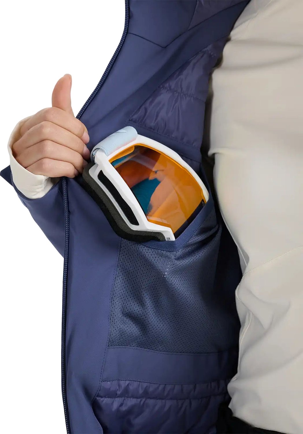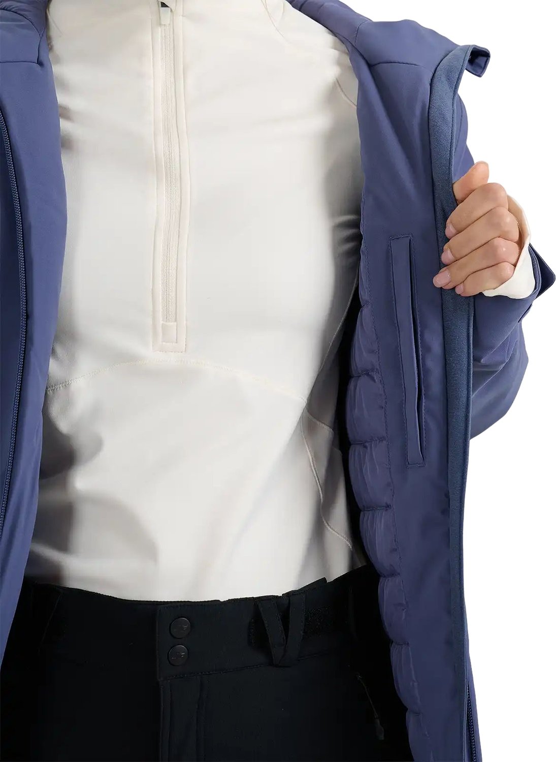 Kurtka została wyposażona w lekką ocieplinę poliestrową, która skutecznie utrzymuje ciepło bez zbędnego obciążenia. Jest to szczególnie ważne podczas długich dni spędzonych na stoku, gdzie komfort termiczny odgrywa kluczową rolę. Dzięki temu rozwiązaniu, użytkowniczki mogą cieszyć się ciepłem bez uczucia ciężkości, co zwiększa ich komfort i zadowolenie z użytkowania. Funkcjonalność kurtki wzbogacają praktyczne kieszenie na zamek. Dwie boczne kieszenie umożliwiają bezpieczne przechowywanie niezbędnych przedmiotów, takich jak telefon czy klucze, a dedykowana kieszeń na ski pass ułatwia dostęp do karnetu. Wewnątrz kurtki znajdują się również kieszenie na gogle oraz drobiazgi, co znacznie zwiększa jej funkcjonalność i praktyczność.