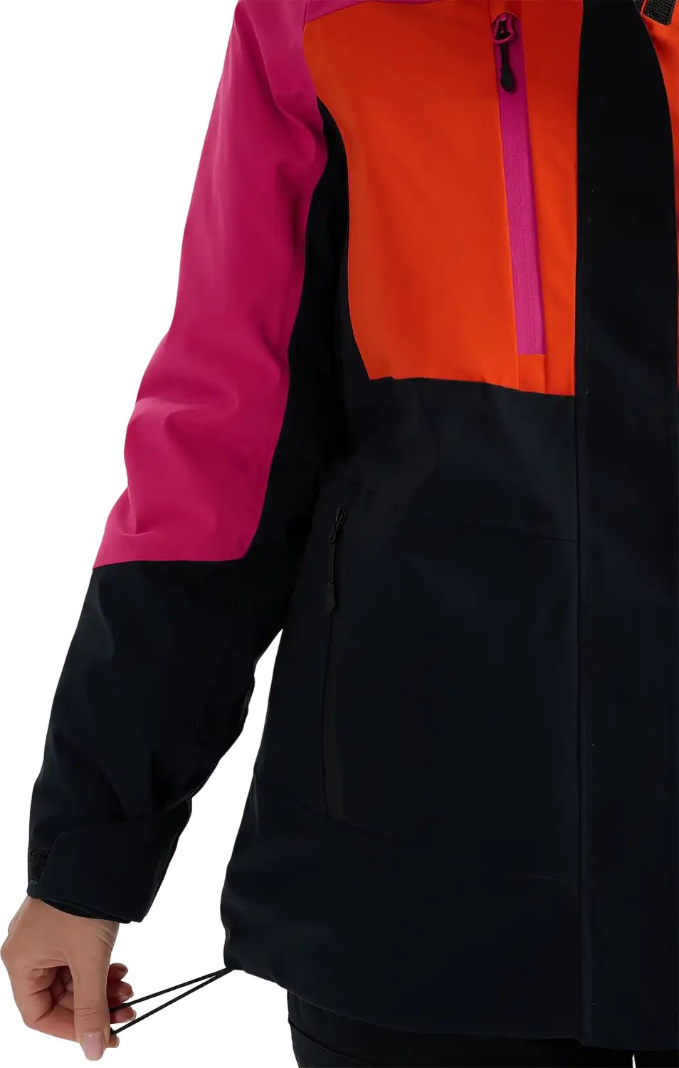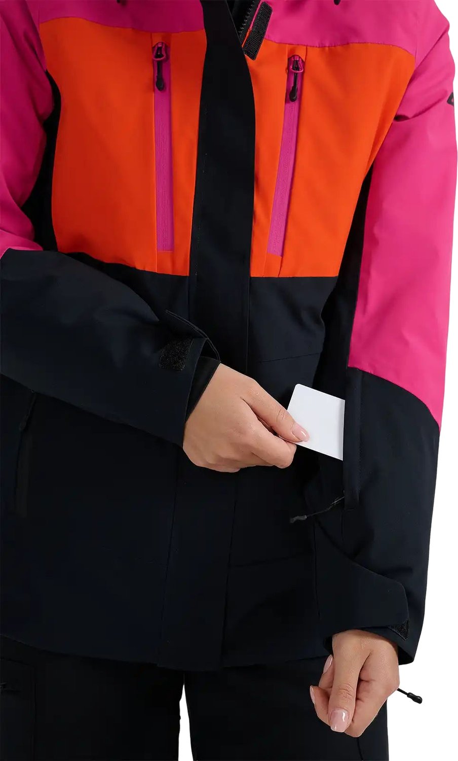Bogaty zestaw kieszeni to kolejny atut tej kurtki. Kieszenie na ski pass, gogle, telefon i inne drobiazgi są nie tylko funkcjonalne, ale także bezpieczne dzięki zastosowaniu zamków. Przedłużone mankiety z regulacją na rzepy stanowią dodatkową ochronę przed chłodem, a pas śnieżny zabezpiecza przed dostawaniem się śniegu pod kurtkę. Regulowany dół kurtki oraz elementy odblaskowe to detale, które podnoszą komfort i bezpieczeństwo użytkowania. Warto również zwrócić uwagę na regulowany dół, który można dopasować do własnych potrzeb.