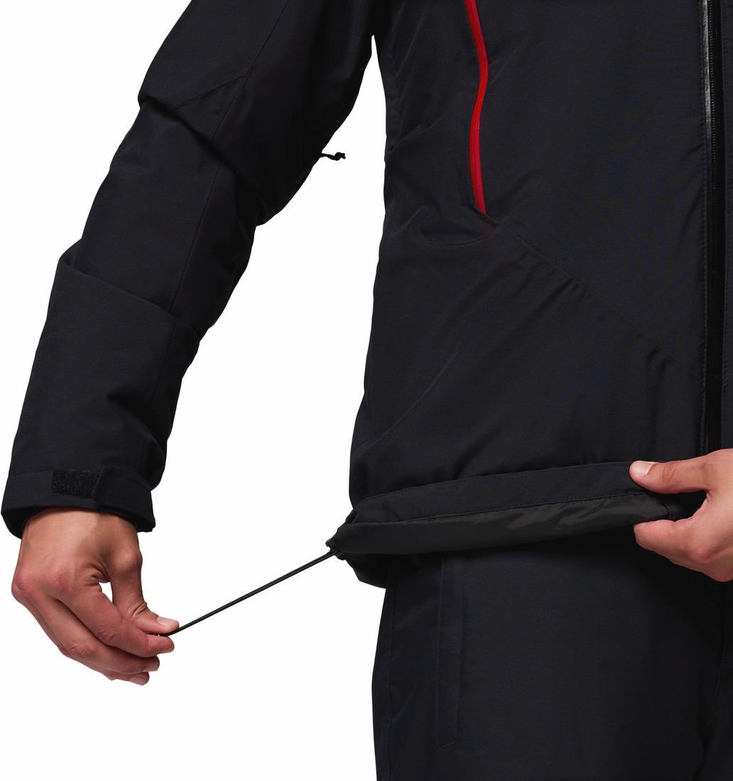 Kurtka wyróżnia się także elastycznością i dopasowaniem do potrzeb użytkownika. Regulowany kaptur, kompatybilny z kaskiem, zapewnia ochronę głowy i szyi, a regulowane mankiety z otworami na kciuki oraz ściągacz w pasie skutecznie chronią przed wnikaniem zimnego powietrza i śniegu. Dzięki zastosowaniu elastycznego materiału, kurtka pozwala na pełną swobodę ruchów, co jest niezwykle ważne podczas uprawiania sportów zimowych.