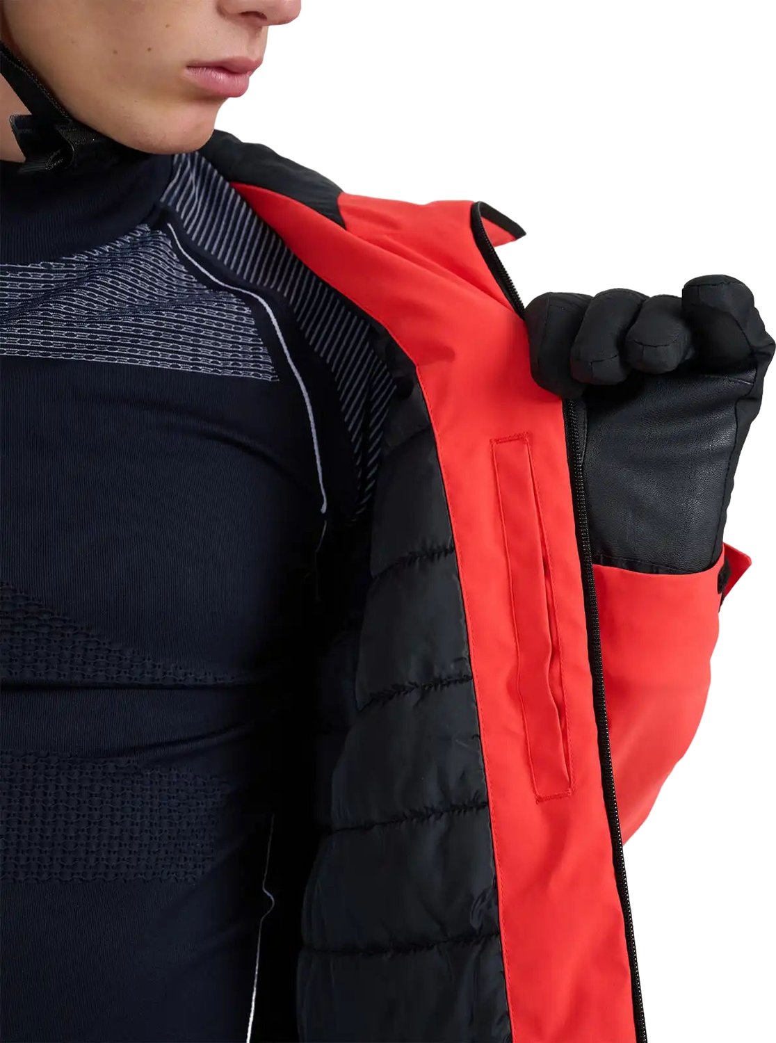 Kurtka została wyposażona w lekką ocieplinę poliestrową, która zapewnia ciepło bez zbędnego obciążania ciała. To rozwiązanie idealne dla tych, którzy cenią sobie swobodę ruchów, jednocześnie nie rezygnując z odpowiedniego komfortu cieplnego. Dodatkowo pikowana podszewka wzmacnia efekt izolacji termicznej, co jest istotne podczas niskich temperatur. Zintegrowany kaptur to kolejny element, który zapewnia ochronę przed śniegiem i wiatrem. Jest to szczególnie przydatne w warunkach zmiennej pogody, kiedy to zaskakujące podmuchy wiatru mogą utrudnić narciarską przygodę. Jednokierunkowy zamek główny umożliwia łatwe i szybkie zapięcie, co jest niezwykle praktyczne podczas dynamicznych zjazdów.