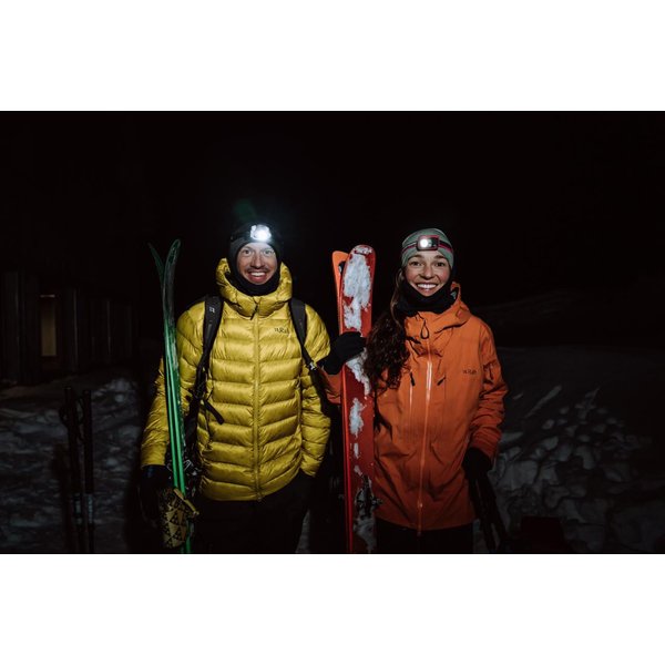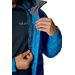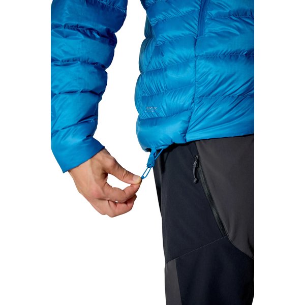 Kurtka została wyposażona w regulowany kaptur z usztywnionym daszkiem, który doskonale mieści się pod kaskiem, zapewniając dodatkową ochronę głowy przed zimnem i deszczem. Elastyczne mankiety dopasowują się do nadgarstków, zatrzymując ciepło wewnątrz kurtki. Praktyczność tej kurtki podkreślają dwie kieszenie zapinane na zamek, które są łatwo dostępne nawet podczas noszenia uprzęży wspinaczkowej. Jedna z kieszeni pełni rolę zintegrowanej kieszeni do przechowywania, co ułatwia jej transport i przechowywanie. Dwukierunkowy zamek błyskawiczny z przodu umożliwia szybką regulację temperatury ciała oraz ułatwia asekurację podczas wspinaczki. Estetykę kurtki dopełnia logo marki Rab na piersi.