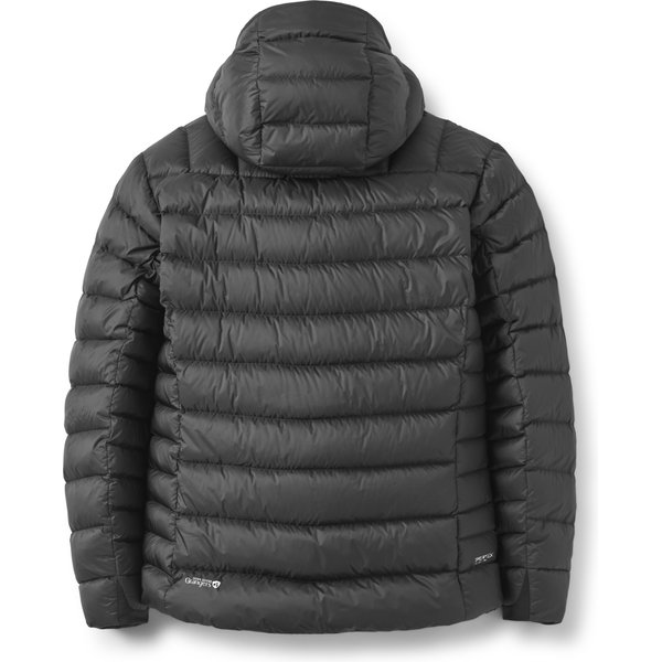 Kurtka została wyposażona w regulowany kaptur z usztywnionym daszkiem, który doskonale mieści się pod kaskiem, zapewniając dodatkową ochronę głowy przed zimnem i deszczem. Elastyczne mankiety dopasowują się do nadgarstków, zatrzymując ciepło wewnątrz kurtki. Praktyczność tej kurtki podkreślają dwie kieszenie zapinane na zamek, które są łatwo dostępne nawet podczas noszenia uprzęży wspinaczkowej. Jedna z kieszeni pełni rolę zintegrowanej kieszeni do przechowywania, co ułatwia jej transport i przechowywanie. Dwukierunkowy zamek błyskawiczny z przodu umożliwia szybką regulację temperatury ciała oraz ułatwia asekurację podczas wspinaczki. Estetykę kurtki dopełnia logo marki Rab na piersi.