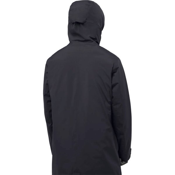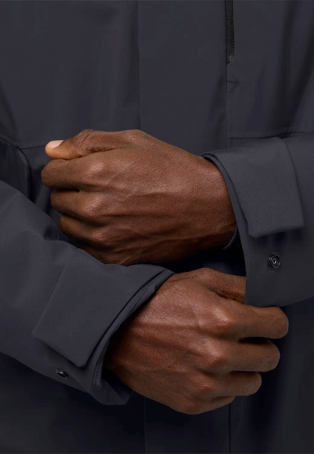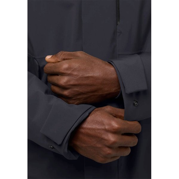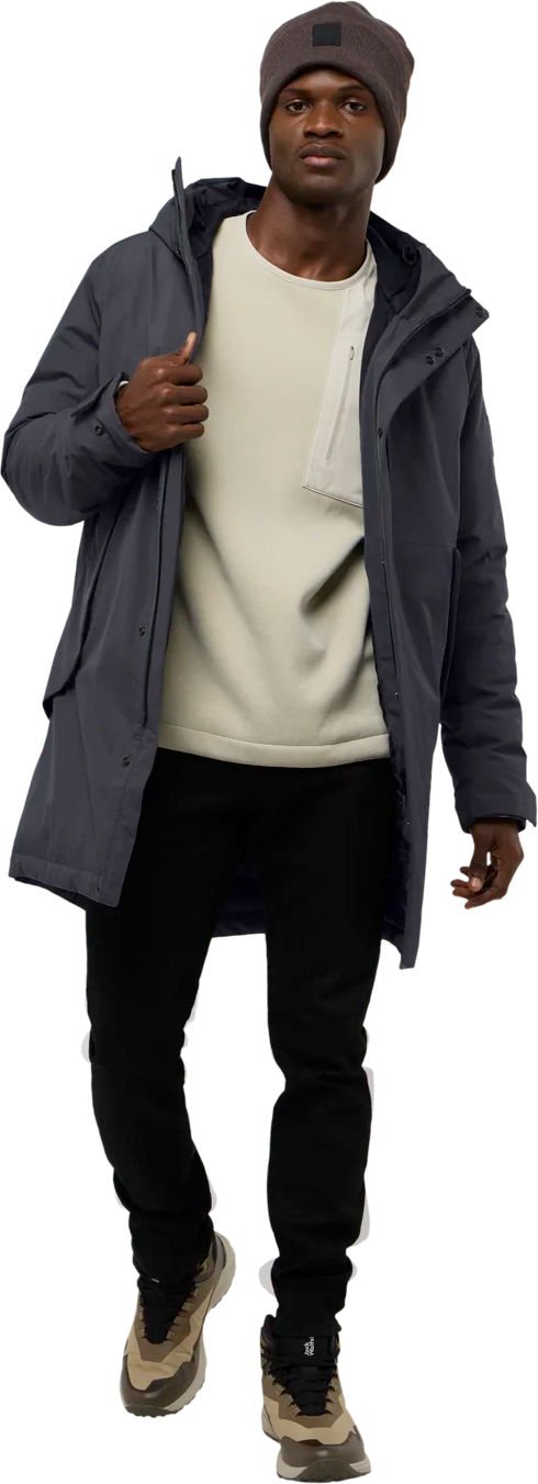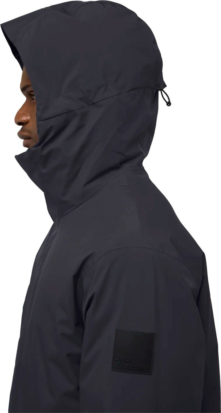 Kurtka została zaprojektowana z myślą o praktyczności. Posiada kilka funkcjonalnych kieszeni: dyskretną kieszonkę na piersi, dwie kieszenie na biodrach oraz jedną kieszeń wewnętrzną. Dzięki temu zawsze będziesz mieć pod ręką najpotrzebniejsze drobiazgi. Dwukierunkowy zamek błyskawiczny z przodu oraz nienasiąkliwe zamki dodatkowo podkreślają jej użytkowy charakter, umożliwiając łatwy dostęp do wnętrza oraz swobodę ruchów. Zintegrowany kaptur z możliwością regulacji pola widzenia i wielkości to kolejny atut tego modelu. W szybki sposób dostosujesz go do swoich potrzeb, co jest szczególnie przydatne w zmiennych warunkach pogodowych. Dzięki prostemu krojowi oraz stylowym detalom, takim jak mankiety z zapięciem na napy czy rozcięcie z tyłu, kurtka doskonale wpisuje się w miejski design, oferując jednocześnie komfort noszenia. Jack Wolfskin zadbał o to, aby kurtka ta była nie tylko praktyczna, ale także estetyczna. Długa forma zapewnia dodatkową ochronę przed chłodem, a jednocześnie stanowi modny element garderoby, który można swobodnie łączyć z innymi częściami odzieży.
