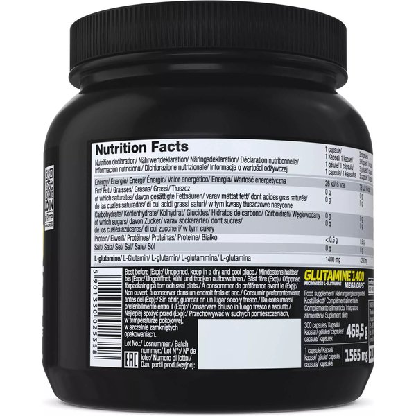 GLUTAMINE MEGA CAPS®/MEGA CAPSULES® jest preparatem, który zawiera 100%-ową farmaceutyczną, mikronizowaną postać glutaminy-aminokwasu występującego w dużym stężeniu w mięśniach oraz plaźmie. Glutamina jest najważniejszym aminokwasem dla adaptacji tkanki mięśniowej. Magazynuje azot organiczny, sprzyja tworzeniu dodatniego bilansu azotowego. Dystrybuuje grupy aminowe do transaminacji i ostatecznie syntezy białek mięśniowych. Glutamina stanowi ponad 60% zasobów wolnych aminokwasów w komórkach mięśniowych i ponad 20% wszystkich aminokwasów występujących w organizmie. Mikronizowana L-glutamina jest formą łatwiej wchłanialną i znacznie aktywniejszą od tradycyjnej glutaminy oraz peptydu glutaminowego.