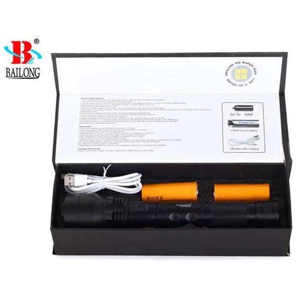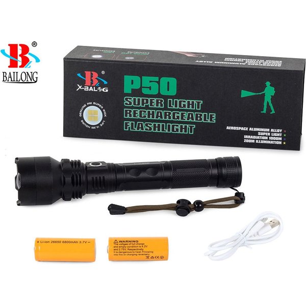 Przedstawiamy latarkę taktyczną BL-P59-2-P50. To sprzęt posiadający aż trzy tryby mocy. Możesz wybrać oszczędny 50%, stroboskopowy lub klasyczny (100%). Latarka oświetli teren do 1000m, jest to bardzo szeroki zasięg. Jeżeli preferujesz innowacyjne rozwiązania, zadowoli Cię także wbudowana funkcja zoom. Dzięki zastosowaniu specjalnej powierzchni, produkt nie wyślizguje się z rąk, a ergonomiczny uchwyt gwarantuje komfort użytkowania latarki. Sprzęt posiada klasę wodoszczelności IPX5, nie musisz się więc martwić o jego zniszczenie w wyniku kontaktu z wodą. Całość waży tylko 340 g.
