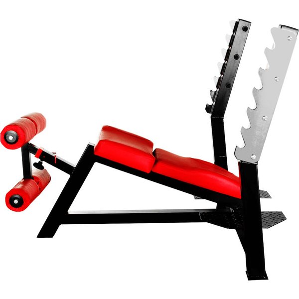 Profilowana tapicerka o grubości 10 cm, użyta w tej ławce, została stworzona w systemie Kelton Performance. Odpowiednio pochylona i wyprofilowana w trzech płaszczyznach, tapicerka utrzymuje prawidłowe ułożenie ciała na ławce, co zwiększa komfort i efektywność treningu. Oparcie pod plecy oraz oparcie pod lędźwie zapewniają dodatkowe wsparcie dla kręgosłupa, co jest niezwykle istotne podczas wyciskania pod kątem ujemnym. Ergonomia i funkcjonalność ławki są doskonale dopasowane do wymogów różnych rodzajów treningów. Metalowa konstrukcja z ząbkowanymi wspornikami na sztangę gwarantuje długotrwałą wytrzymałość i odporność na intensywne użytkowanie.
