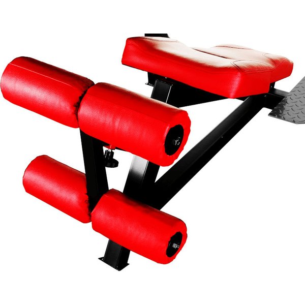 Bezpieczeństwo to kolejny aspekt, który został starannie przemyślany. Ławka wyposażona jest w nachylone stojaki z numerowanymi hakami asekuracyjnymi, co zapewnia szybkie odłożenie sztangi podczas samotnych treningów. Liczba sześciu par haków asekuracyjnych z rozstawem co 9 cm pozwala na precyzyjne i pewne umieszczenie sztangi, co minimalizuje ryzyko kontuzji. Dodatkowo, antypoślizgowa platforma na stopy oraz podesty asekuracyjne zlokalizowane zaraz nad głową ćwiczącego umożliwiają bezpieczne podnoszenie ciężaru bez nadmiernego obciążania pleców. Kolejną korzyścią jest pełna regulacja modułu na nogi. Dzięki ośmiu poziomom regulacji, każdy użytkownik może idealnie dostosować ustawienie do swojego wzrostu, co przekłada się na komfort i skuteczność treningu. Wałki na nogi pokryte tapicerką oraz podwójne wałki zapewniają stabilność i wygodę podczas ćwiczeń.
